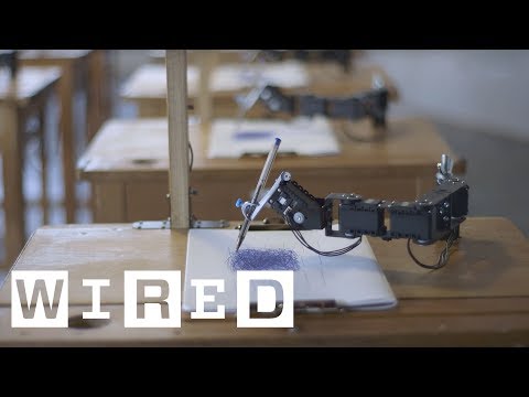 5:28 Meet the Robot Portrait Artists in this 'Robot Classroom' | WIRED WIRED gets an exclusive look at artist Patrick Tresset's new exhibition. His "robot classroom" features 20 robots that chat in Morse code and learn to draw in scribbles, while three other robots sk...